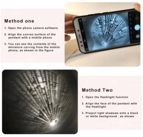 • Apresenta a mensagem “I love you” em 100 idiomas, gravada com o método de nano micro entalhe. Pode ver através de todas as lentes de câmara/smartphone padrão. Projete o coração central num fundo preto com a lanterna da câmara para mostrar o seu amor.