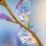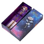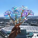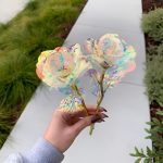 Cada rosa é trabalhada com um revestimento iridescente e holográfico que cintila lindamente à luz, criando um brilho semelhante ao de uma galáxia, simplesmente hipnotizante.
