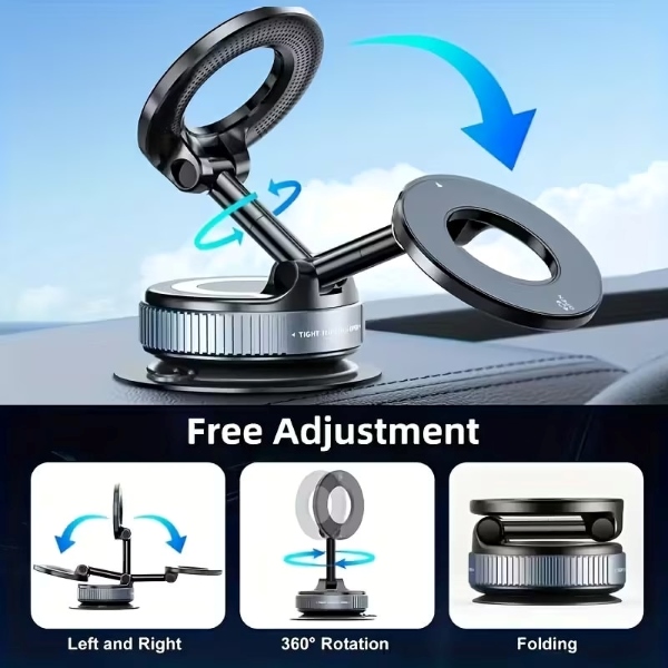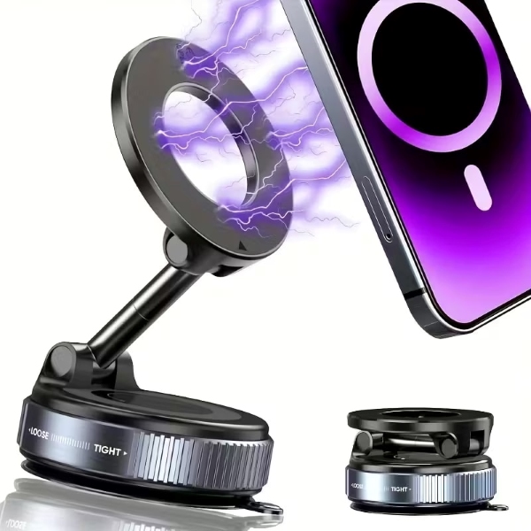 O suporte para telemóvel MAGHOLDZ utiliza uma potente fixação a vácuo que se intensifica com as vibrações, mantendo o telemóvel firmemente preso em superfícies lisas sem deixar marcas no vidro, no tablier ou na secretária.